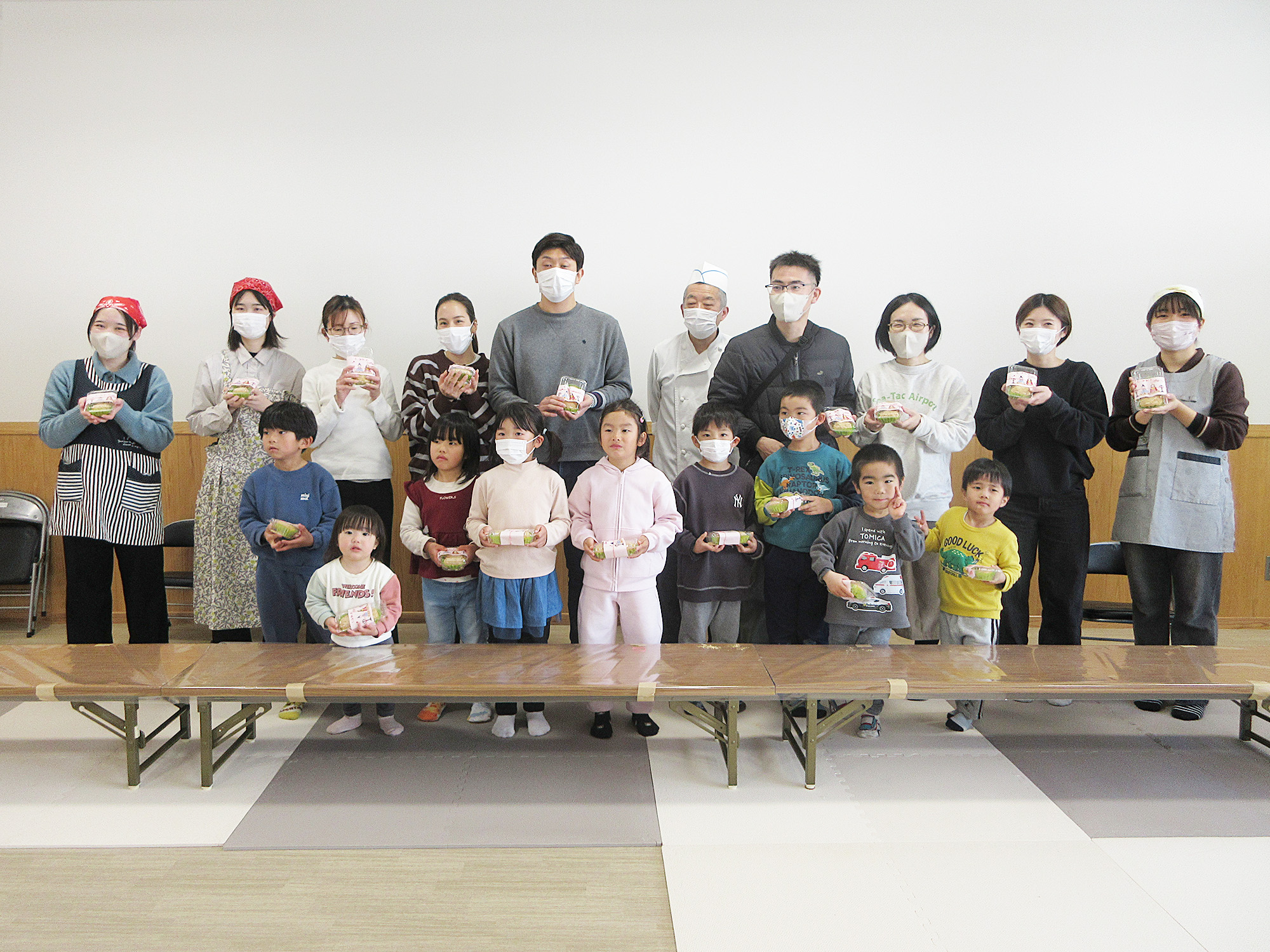 認定しろとりこども園の園児(年長児)9名、保護者8名、徳島文理大学の教授1名、生徒2名、市役所地域交流担当1名、婦人部の方々、本町コミュニティ協議会が参加され、